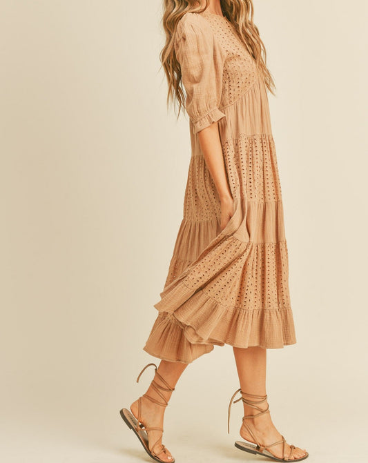 SMOCK WAIST KIMONO SLEEVE EYELET DRESS