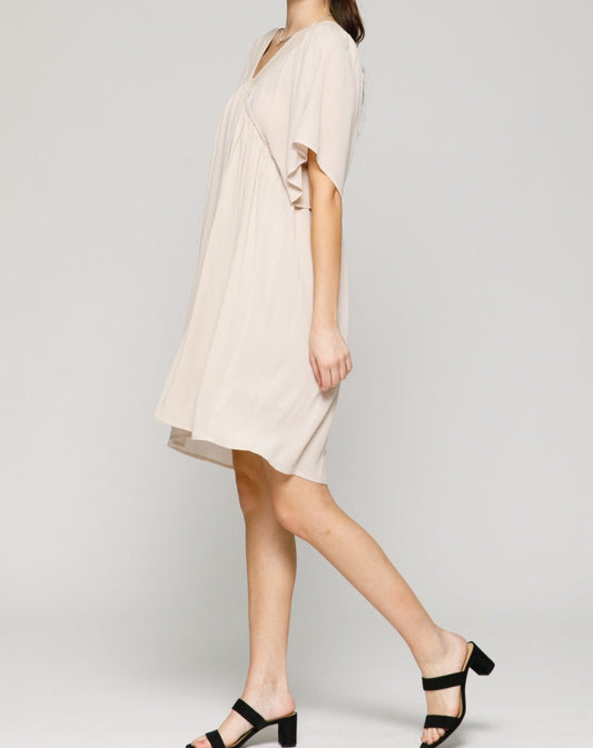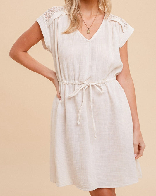 LACE INSTET V-NECK CINCHED WAIST GAUZE DRESS