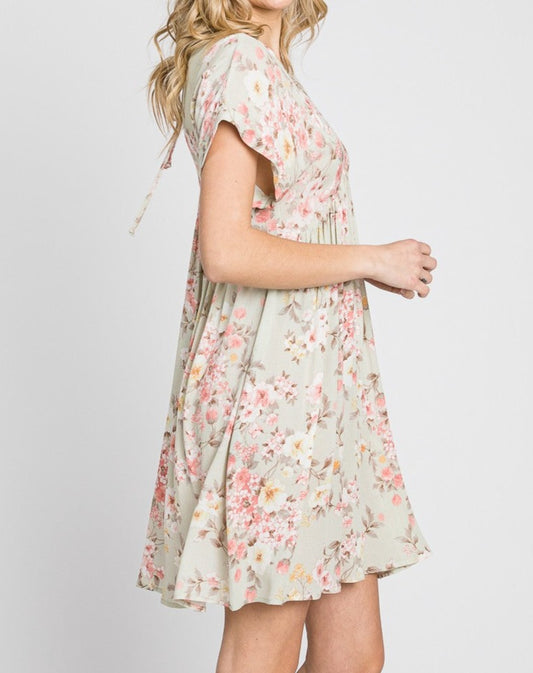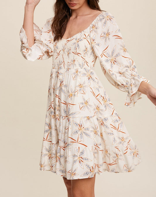 SMOCKED SWEETHEART FLOWER PRINT MID SLEEVE DRESS