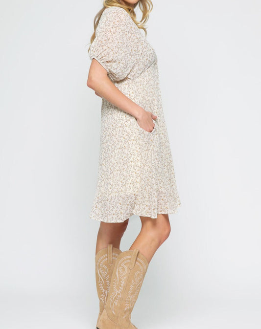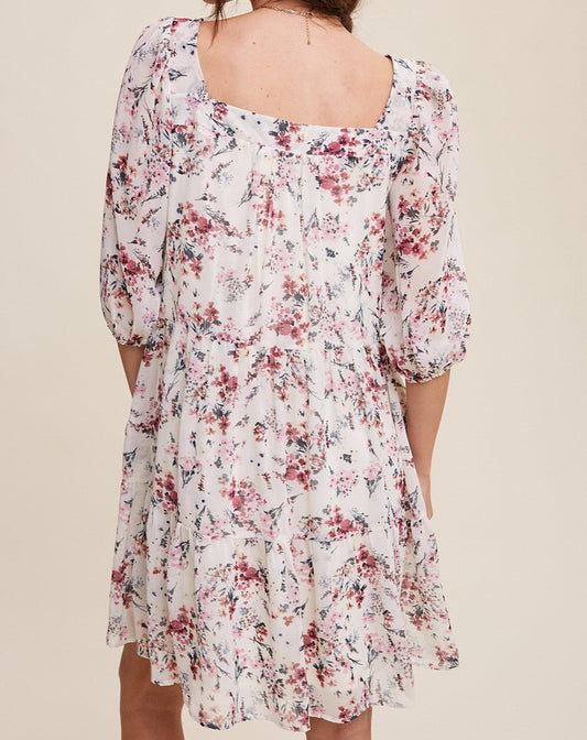 FLORAL PRINT SQUARE NECK BUTTON FRONT CHIFFON DRESS